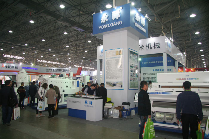 十一月四日,第十四屆中國國際糧油產品及設備技術展示交易會在江西南昌隆重開幕。與世界糧機巨頭瑞士布勒和日本佐竹一起,湖北永祥糧機在會展中心C館顯要位置推出全自動礱谷機、白米分級篩、平面回轉篩、長度精選機、厚度分級機、立式砂輥碾米機、立式鐵輥碾米機、大米拋光機、大米色選機等十臺專業碾米單機設備。